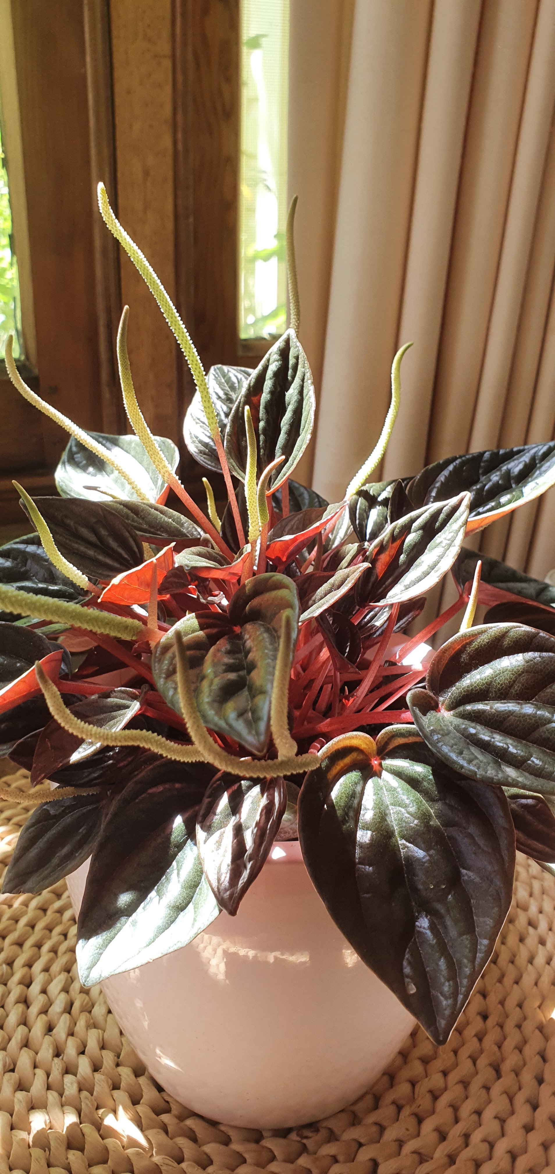 I bought this unusual plant about 6 weeks ago. In place of my usual Madonna (peace) Lily. I give it love everyday and it’s just flourishing, but it may also be the filtered daily light helping it reach upward. It sits on the old walnut table close to the windows where I eat and write. God I love nature….such a blessed thing..πŸŒ·πŸ™πŸ’™