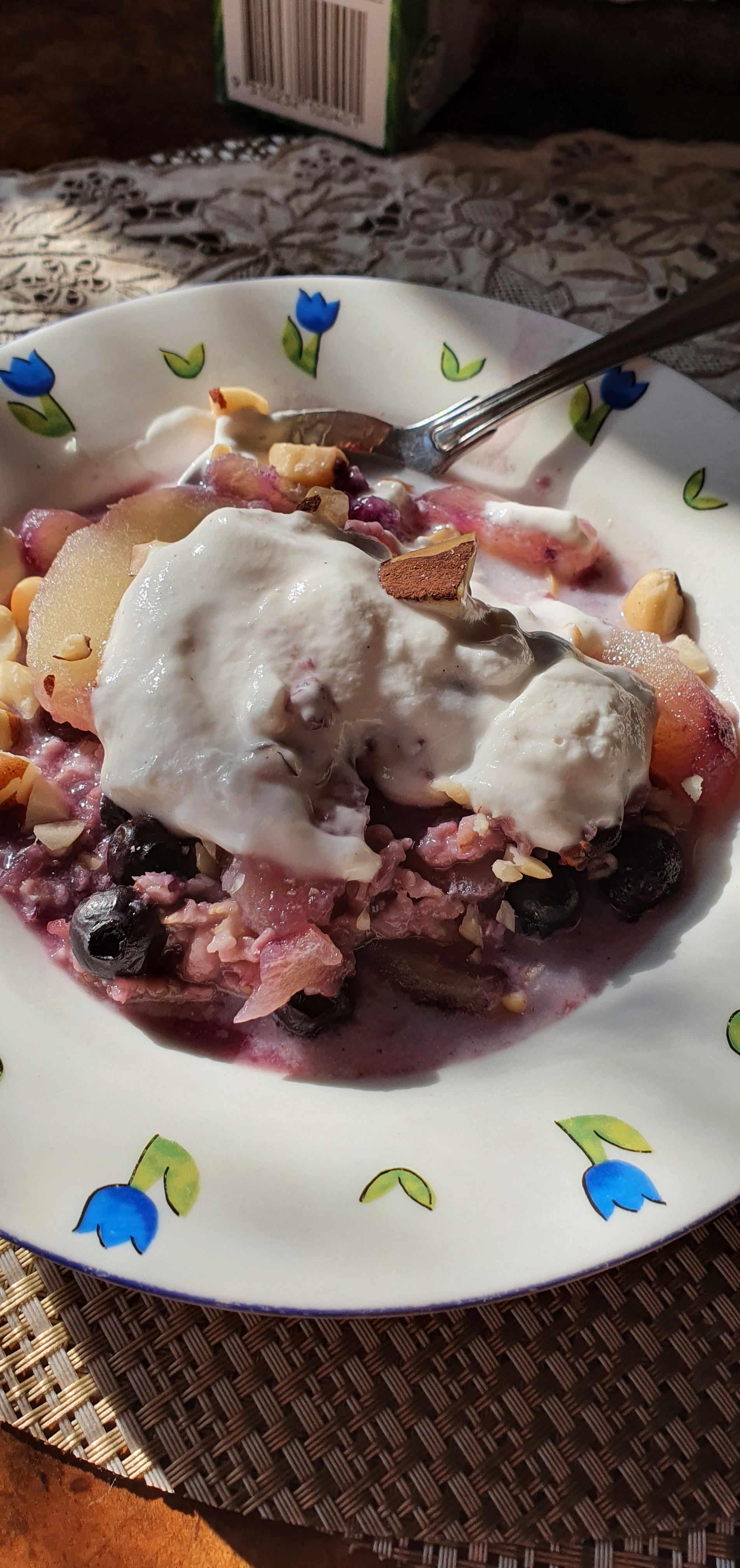 When it cooled I added a topping of vanilla coconut yoghurt and chopped Brazil nuts. It was yummy. I am going to try making a variation on this too with bananas and hazelnuts.